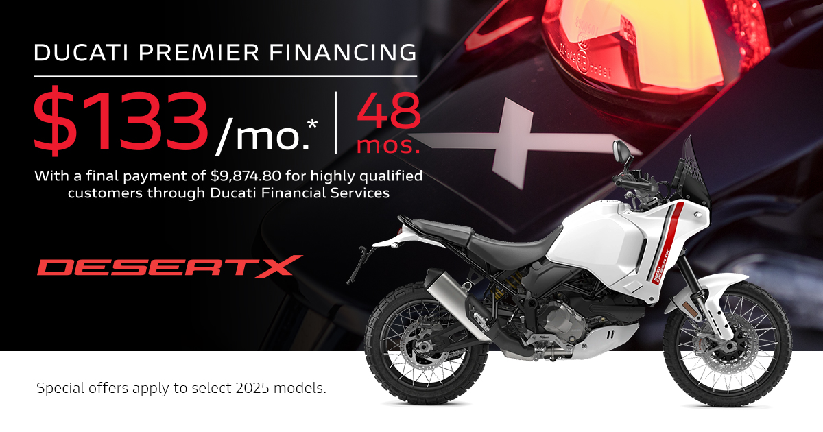 Offer available on select 2025 models to highly qualified customers on approved credit by Ducati Financial Services through participating and authorized Ducati dealers from December 2 - 30, 2025. Payments calculated with a $995 freight & setup. Payments shown exclude tax, title, license, options and dealer fees. Final terms and pricing are subject to negotiation between you and your dealer. APR stated not available in AL, IA, IL, KY, MI, OH, OK, SC & VA. Minimum amount financed of $10,000 to be eligible in MD & HI. Selling price must exceed $10,000 to be eligible in NJ and $7,500 to be eligible in NC. Ducati Premier Financing not available in NH, & PA. See your local Ducati dealer for financing details or, for general product information, call 1-888-391-5446. VW Credit, Inc. dba Ducati Financial Services is a servicer for VCI Loan Services, LLC. © 2025 Ducati North America.