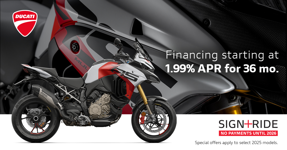 Offer available on select 2024 and 2025 models to highly qualified customers on approved credit by Ducati Financial Services through participating and authorized Ducati dealers from October 1 - 31, 2025. Down payment requirement varies from 0%-25% of the purchase price based on credit worthiness. Not all customers will qualify for the advertised APR. Minimum amount financed is $5,000. See your local Ducati dealer for financing details or, for general product information, call 1-888-391-5446. VW Credit, Inc. dba Ducati Financial Services is a servicer for VCI Loan Services, LLC. © 2025 Ducati North America.