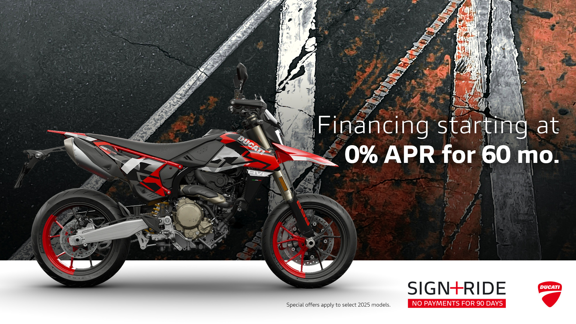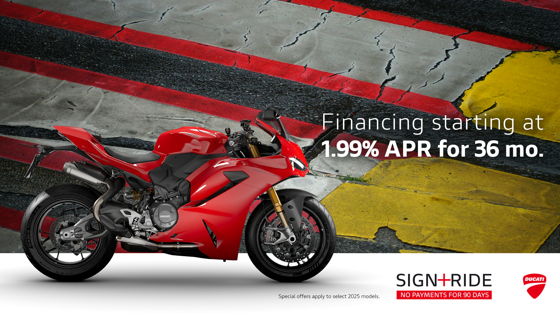 Offer available on select 2025 models to highly qualified customers on approved credit by Ducati Financial Services through participating and authorized Ducati dealers from January 6 - 31, 2026. Down payment requirement varies from 0%-25% of the purchase price based on credit worthiness. Not all customers will qualify for the advertised APR. Minimum amount financed is $5,000. See your local Ducati dealer for financing details or, for general product information, call 1-888-391-5446. VW Credit, Inc. dba Ducati Financial Services is a servicer for VCI Loan Services, LLC. © 2025 Ducati North America.